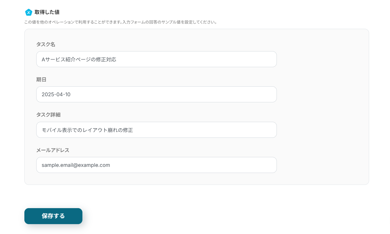 - 「取得した値」にはそれぞれ、Asanaへのタスク追加のテストで使用するサンプル値を設定します。