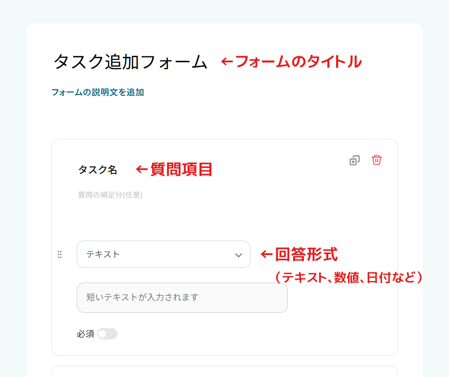 - Asanaにタスクを追加するための質問項目がデフォルトで設定されています。