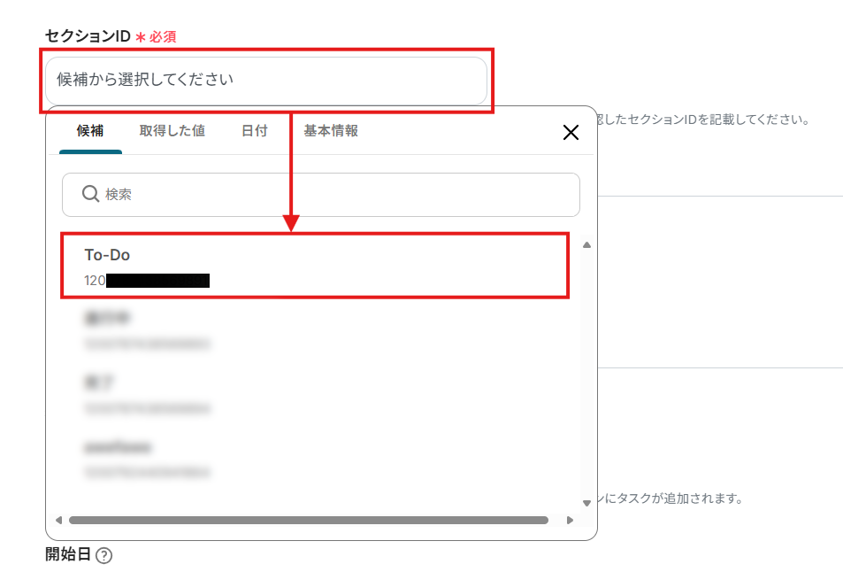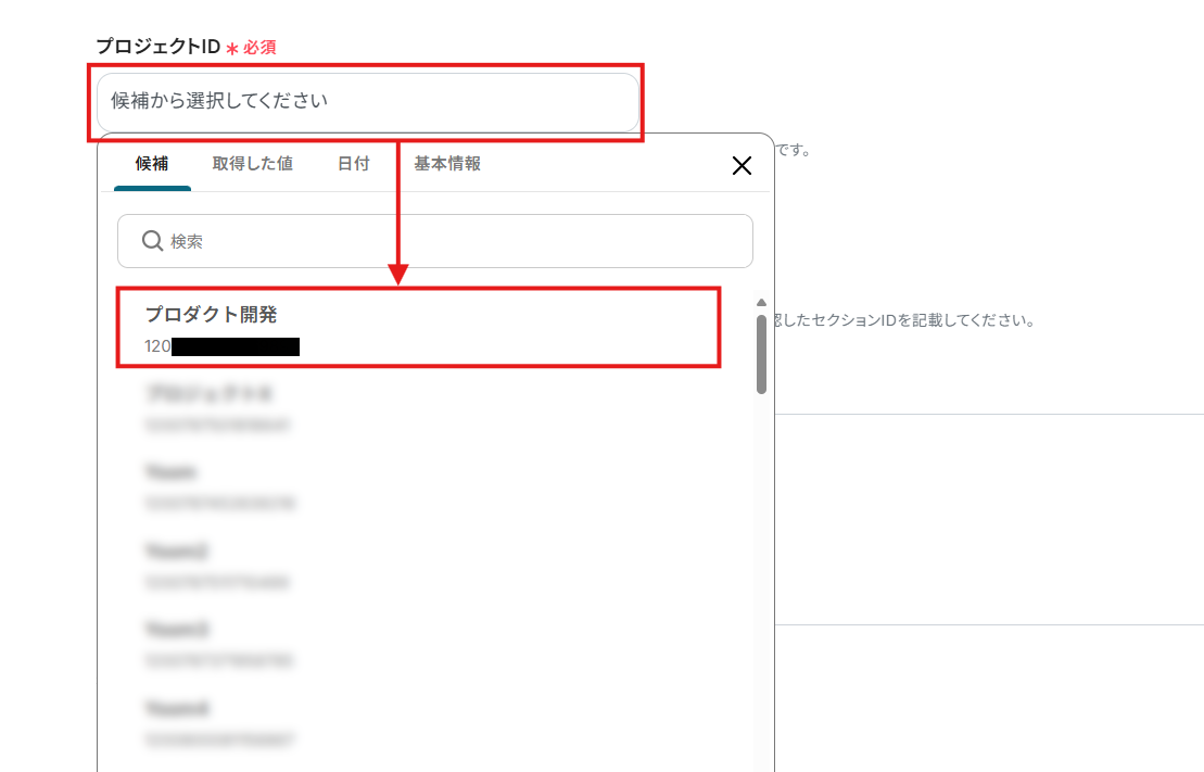 - 「プロジェクトID」の入力欄をクリックすると、連携しているAsanaアカウントのプロジェクトから候補が表示されます。