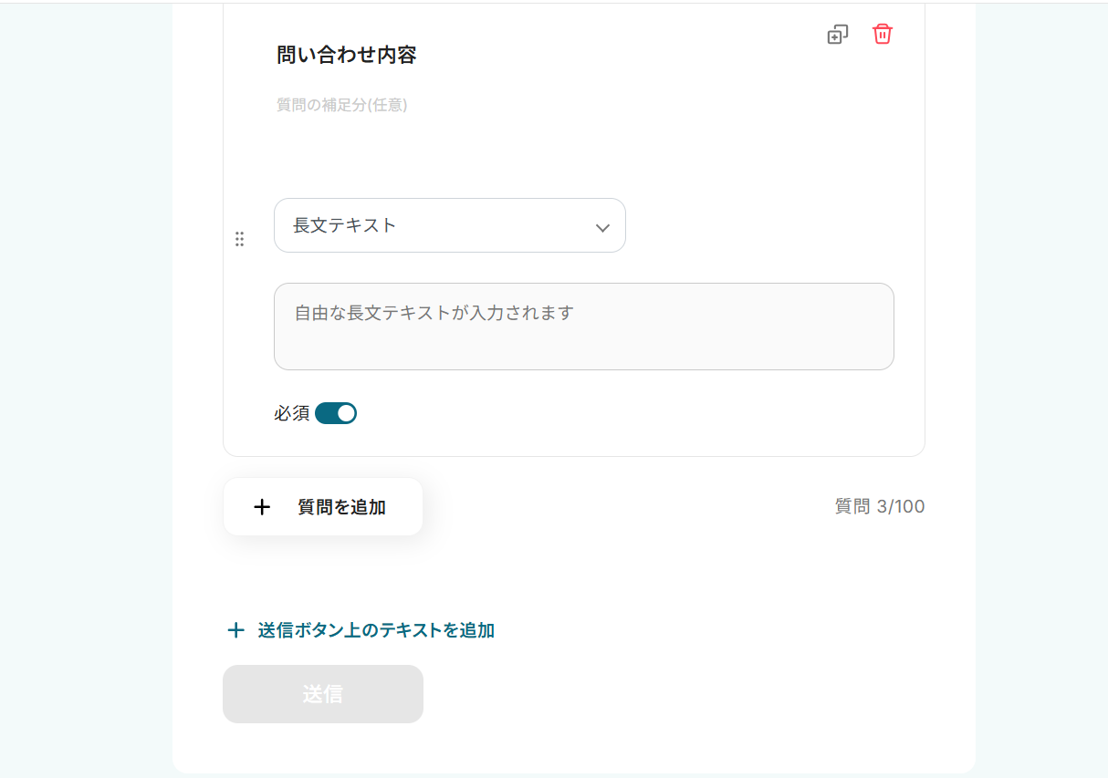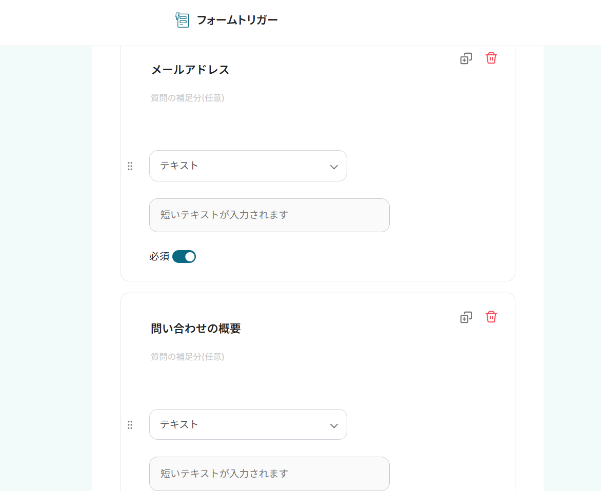 フォームトリガーで設定するフォームの項目は、業務内容に合わせて自由に編集が可能です。例えば、記事のタイトルや含めたいキーワードなどを入力する項目を追加できます。 ChatGPTでテキストを生成する際のプロンプト(指示文)は、任意の内容に設定できます。生成したい文章の構成やトーン、文字数などを具体的に指定し、アウトプットを調整してください。 ■注意事項