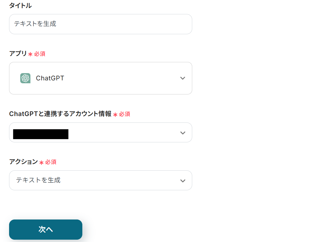タイトルと連携するアカウント情報を任意で設定し、アクションはテンプレート通りのまま「次へ」をクリックして進んでください。