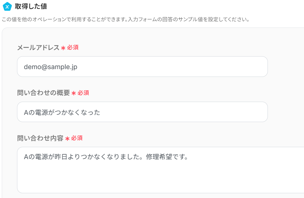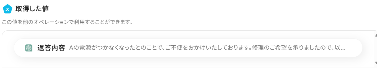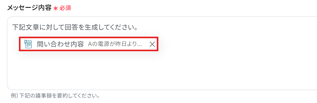 メッセージ内容 :例文が入力されているので、問題なければそのまま使用します。 赤枠は取得値を利用した箇所です。 ※選択した項目は赤枠のように表示されます。 値を引用している印なので、これによってトリガーで取得した値をそのまま利用できます。 ここに固定の問い合わせ内容を設定してしまうと、フロー起動時に毎回それについて生成されてしまうので、取得した値から必ず選択してください。