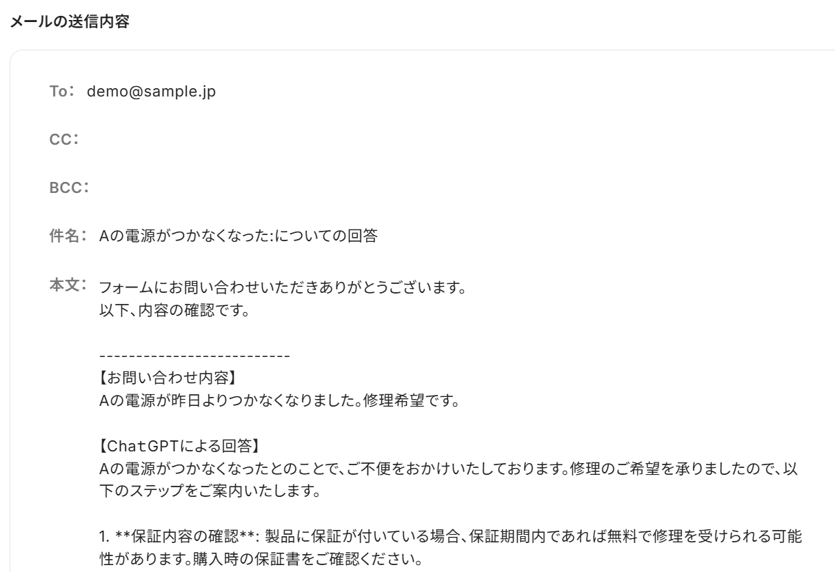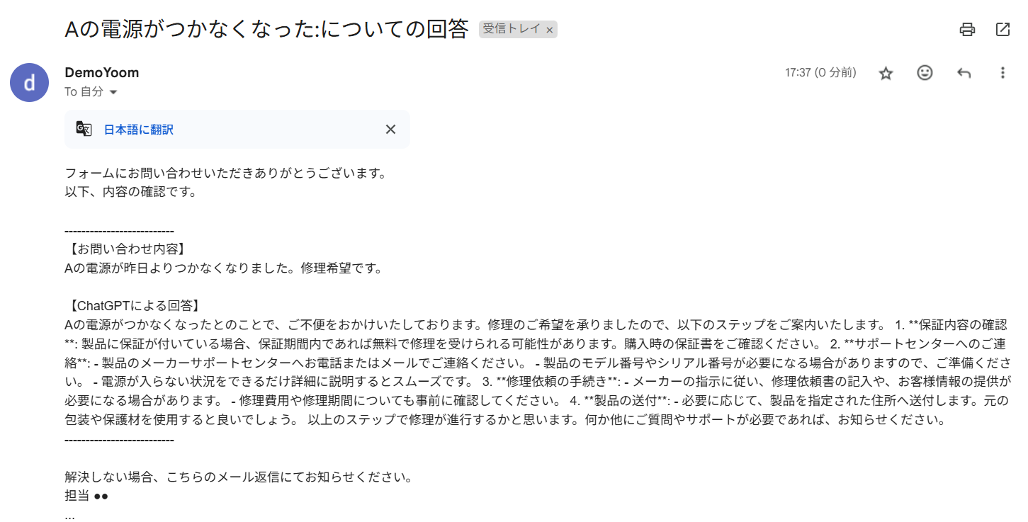 以上が「フォーム回答されたら、ChatGPTで回答を生成しメールを送信する 」方法でした。