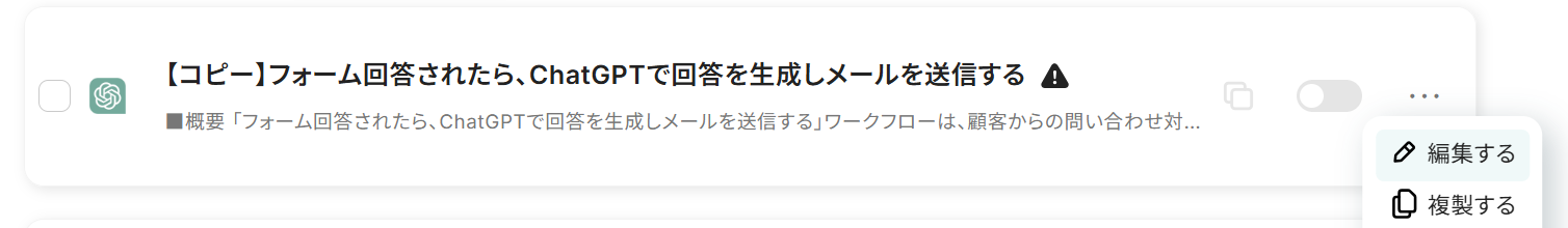 以下の画像が表示されたら、トリガーをONにしてください。 これですべての設定が完了したので、フォーム回答されたら、ChatGPTで回答を生成しメールを送信されるかを確認してみましょう。