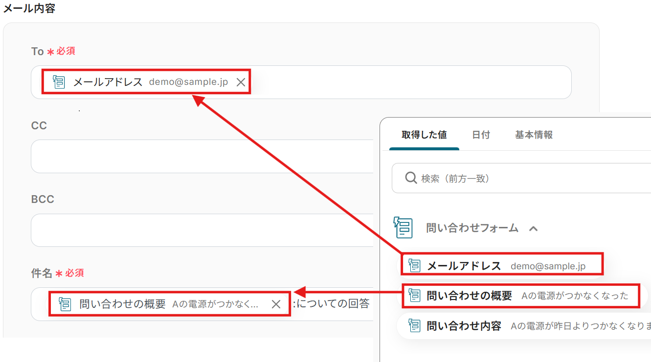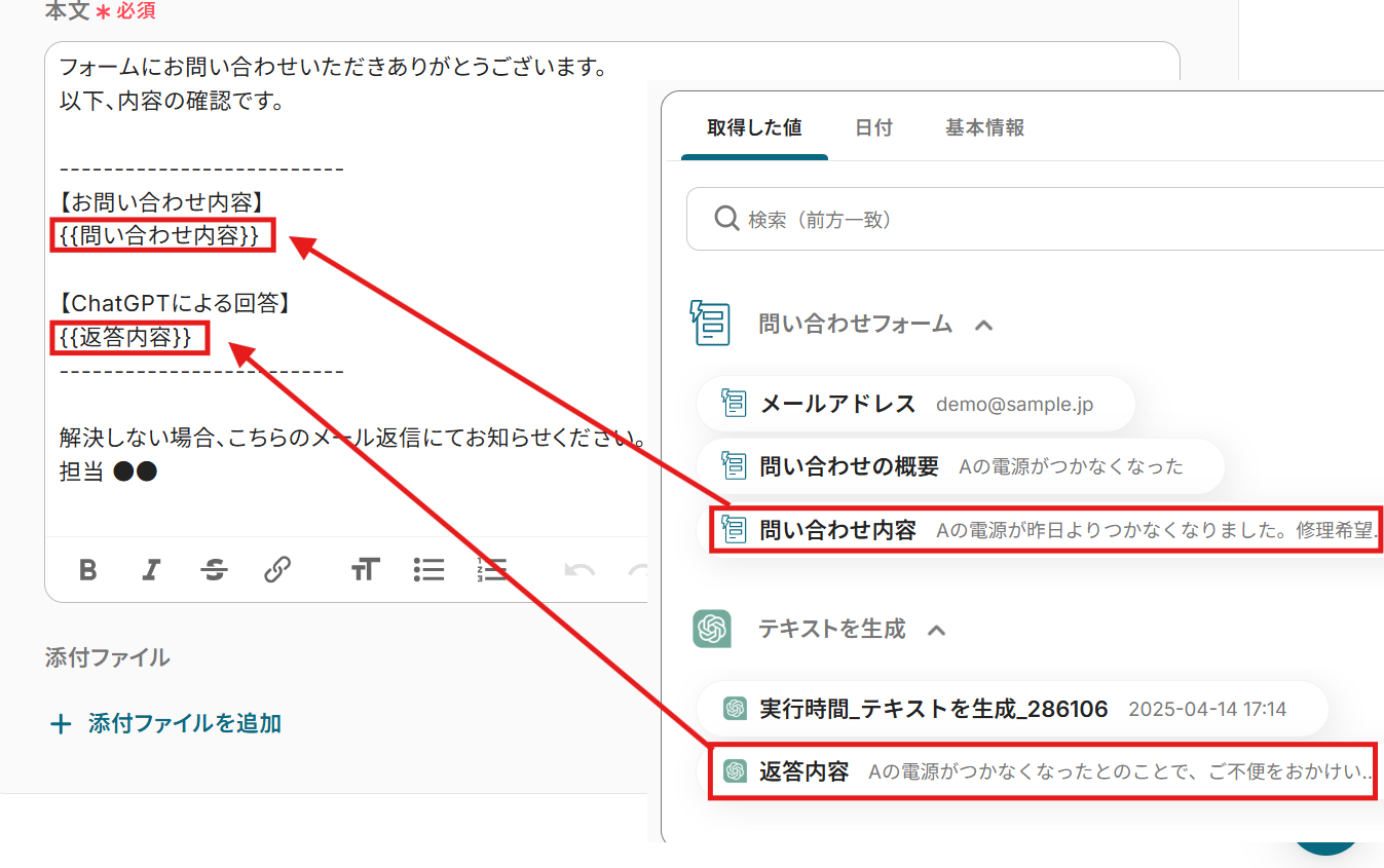 本文 :こちらも取得値を活用して設定しました。 以下の内容は例です。