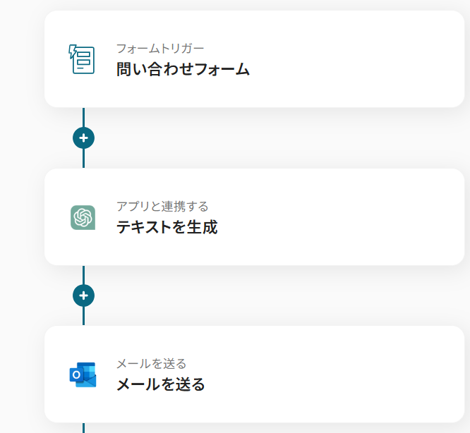 はじめに、ChatGPTとOutlookをYoomと連携します。 次に、トリガーでフォームトリガーを設定し、問い合わせを受け付けたい項目などを任意で作成します。 続いて、オペレーションでChatGPTの「テキストを生成」アクションを設定し、フォームで受け付けた内容をもとにメール文面を生成するようプロンプトを記述します。 最後に、オペレーションでOutlookの「メールを送る」アクションを設定し、ChatGPTが生成したテキストを本文に含めて送信するよう設定します。 ※「トリガー」:フロー起動のきっかけとなるアクション、「オペレーション」:トリガー起動後、フロー内で処理を行うアクション
