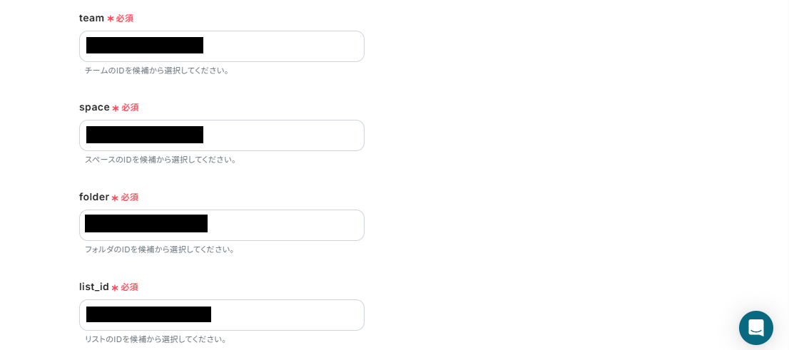 space、folder、list_idも同様に候補から任意で選択しましょう。