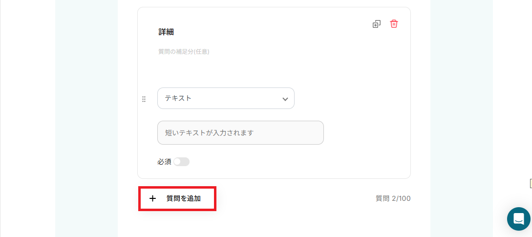 また、項目を追加したい場合は下記画像の赤枠部分「質問を追加」をクリックしてください。