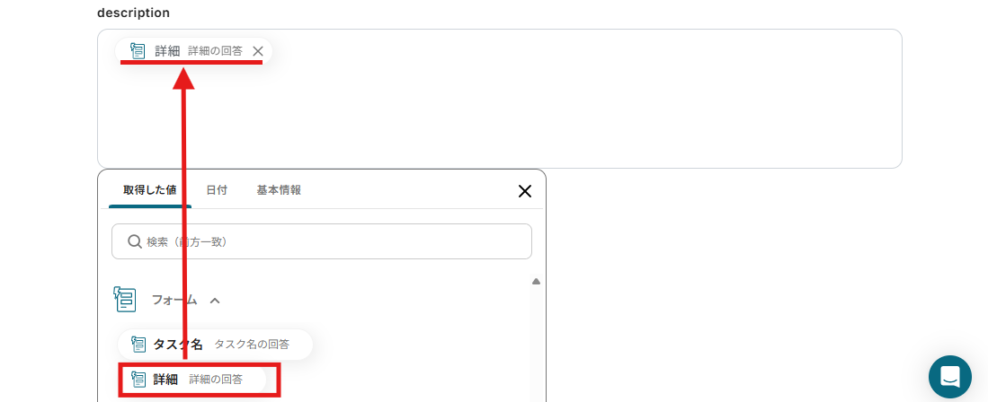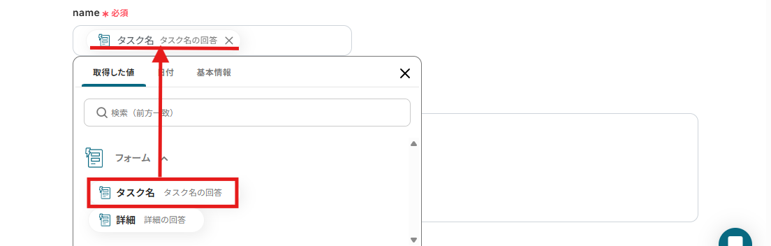 このように設定すると、フォームに新規回答がされたら「タスク名」を自動で取得し、ClickUpの新しいタスクのnameに設定することができます。