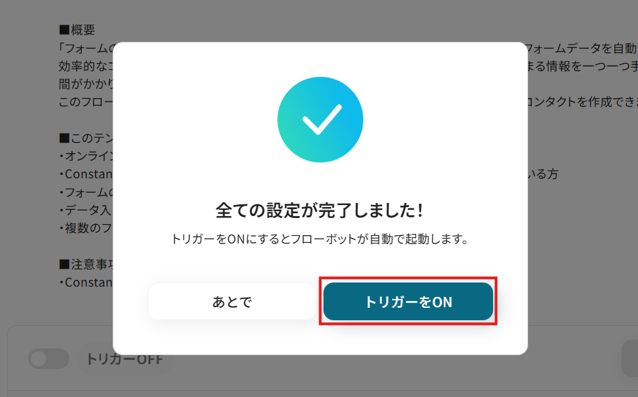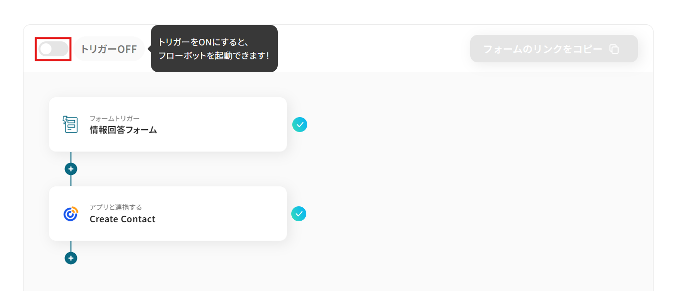 このワークフローを活用すれば、フォームが送信されると同時に、その情報を基にConstant Contactへ自動でコンタクトを作成するため、リード情報を迅速かつ正確に管理できるようになるはずです。