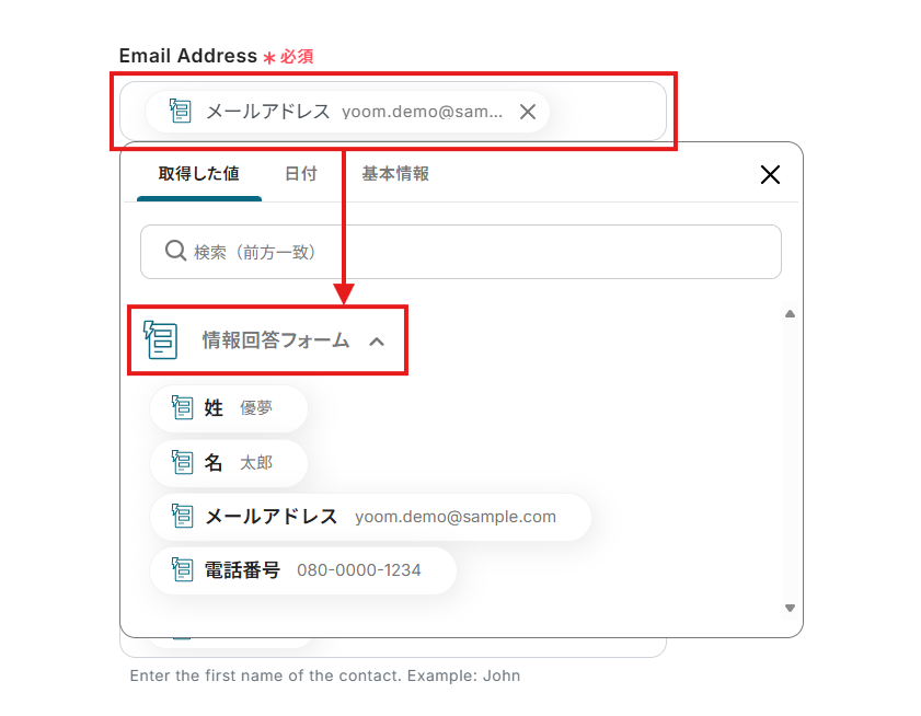 - 「コンタクトを作成する」では、フォームトリガーで取得した情報を変数として引用できます。