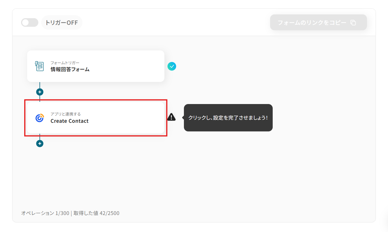 - 最後に、オペレーションでConstant Contactの「Create Contact」アクションを設定し、トリガーで取得したコンタクト情報を紐付けます。
