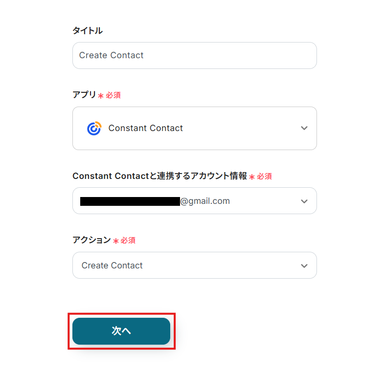 - 最後に、オペレーションでConstant Contactの「Create Contact」アクションを設定し、Jotformから取得した情報をもとにコンタクトを作成します。