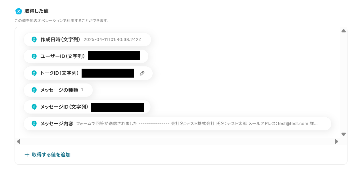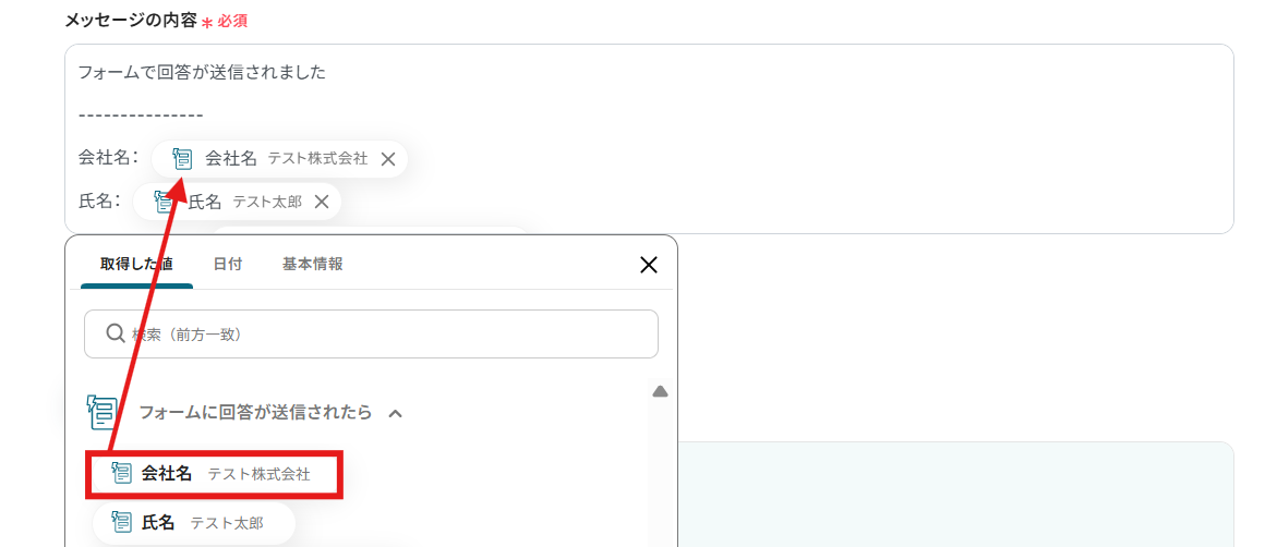 取得した値には、以下の画像のようにテストで使用する会社名などを設定しておきましょう。フロー起動後はフォームの回答が自動反映されます。