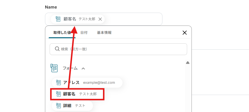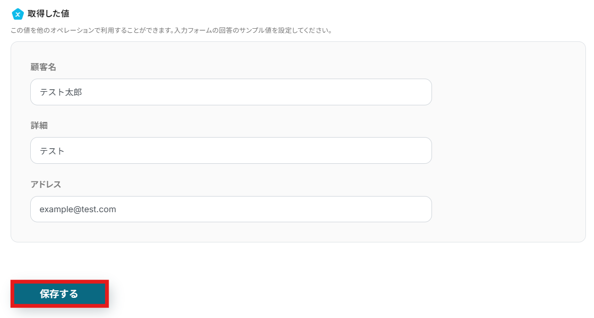 取得した値には、以下の画像のようにテストで使用する本文などを設定しておきましょう。