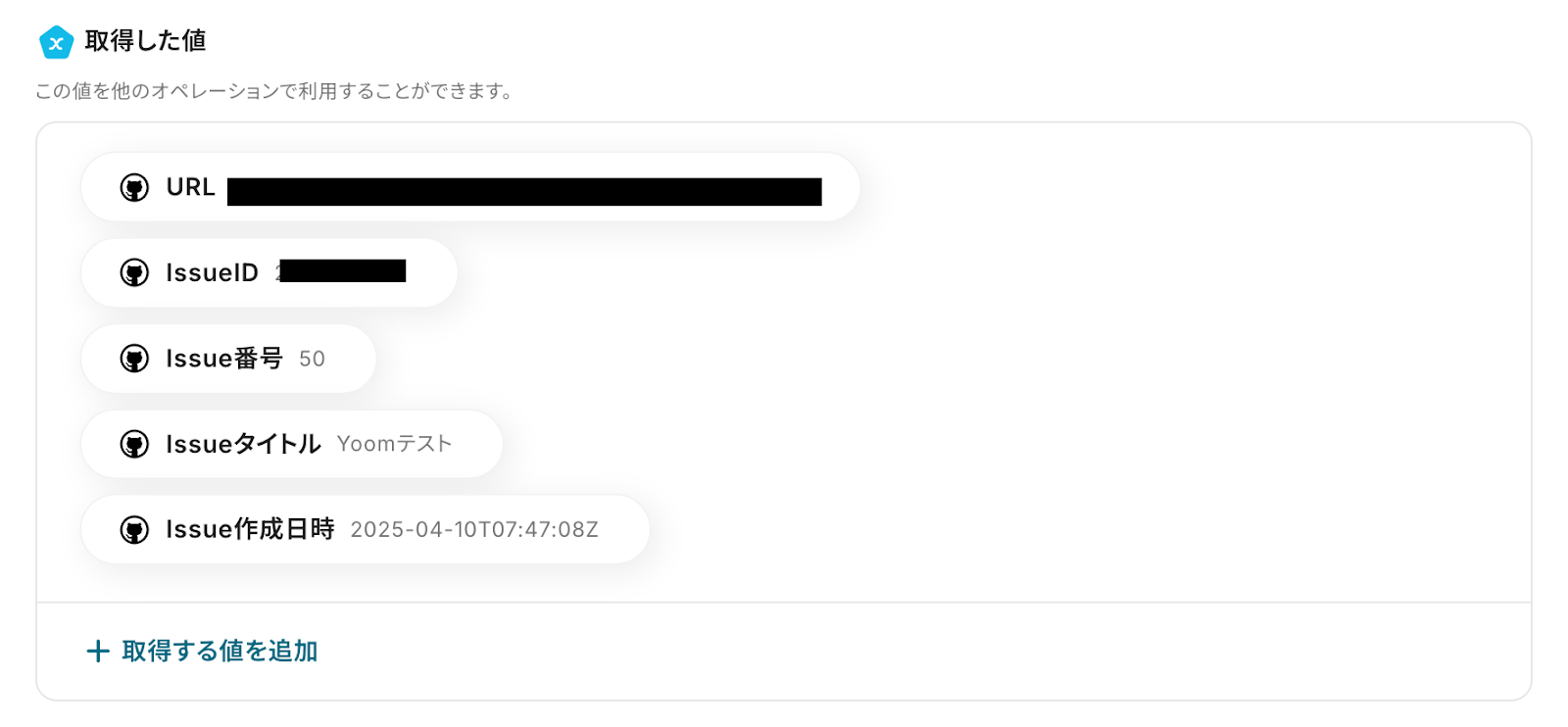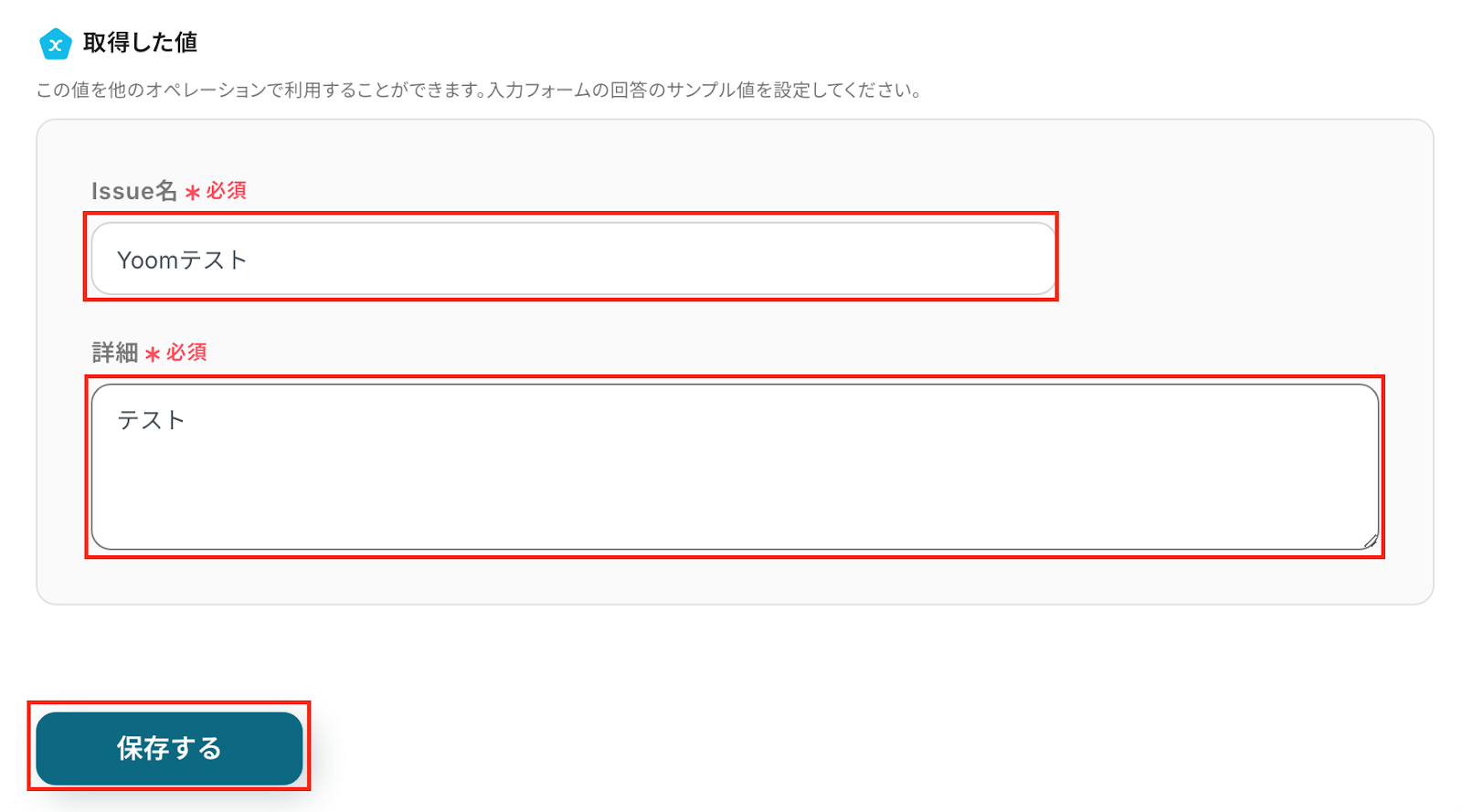 ここでは、次ステップのGitHubにIssueを作成する設定で使用するサンプル値を入力しましょう。