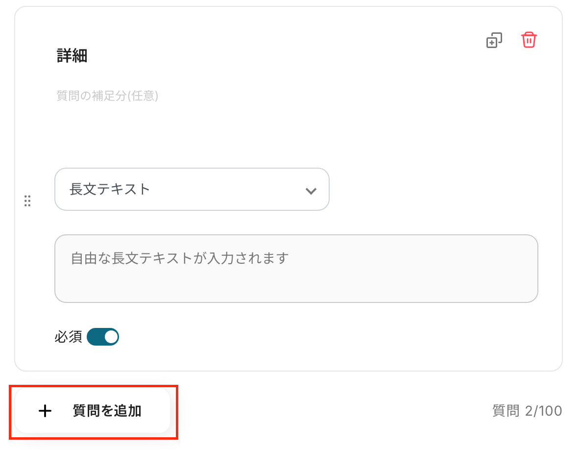 質問を追加したい場合は、「+質問を追加」をクリックしてください。