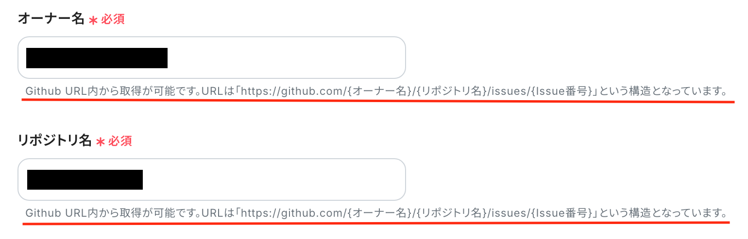 続いて、API接続設定を行います。まず、「オーナー名」と「リポジトリ名」を入力欄下の注釈を参考にして入力してください。
