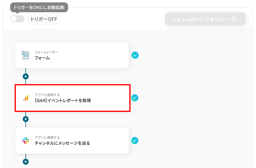 はじめに、Google アナリティクスとSlackをYoomと連携します。 次に、トリガーでフォームトリガー機能を選択し、「フォームが送信されたら」というアクションを設定します。 次に、オペレーションでGoogle アナリティクスを選択し、「【GA4】イベントレポートを取得」アクションを設定します。 最後に、オペレーションでSlackを選択し、「チャンネルにメッセージを送る」アクションを設定し、取得したレポート内容を任意のチャンネルに通知します。 ※「トリガー」:フロー起動のきっかけとなるアクション、「オペレーション」:トリガー起動後、フロー内で処理を行うアクション
