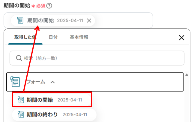 期間の開始、期間の終わり:それぞれの入力欄をクリックすると、下記のような値が表示されます。各項目に合わせて、期間の開始と終わりを選択しましょう。※ 取得した値について