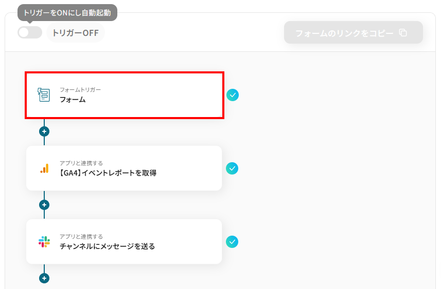 「フォームの回答内容をもとにGoogle アナリティクスでイベントレポートを取得して、通知する」ワークフローを利用すると、Google アナリティクスのイベントレポートが手軽に取得できます。
