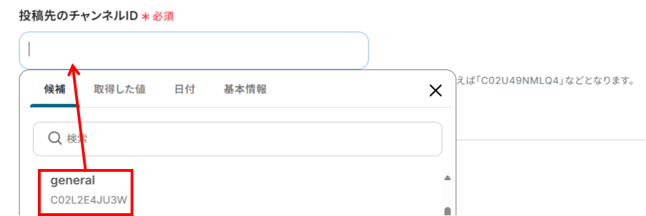 投稿先のチャンネルID:入力欄をクリックすると下記のように候補が表示されます。先ほど作成したSlackのチャンネルを選んでください。