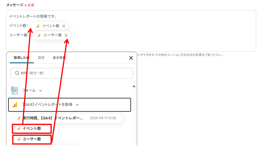 メッセージ:Slackに送信するメッセージ内容を入力します。入力欄をクリックすると、前のステップで取得したGoogle アナリティクスのデータを選択できます。送信したい内容をお好みでカスタマイズしてください。