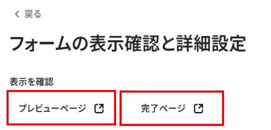 3.フォームの表示確認と詳細設定 下記の赤枠を選択し、先ほど設定したフォームの内容が正しく反映しているかプレビューで確認してみましょう。 内容に誤りがあれば、前画面に戻り修正してください。