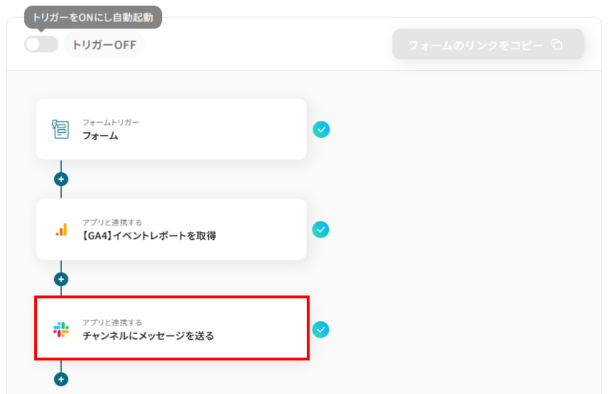 - メッセージ:Slackに送信するメッセージ内容を入力します。入力欄をクリックすると、前のステップでアウトプットしたGoogle アナリティクスのデータを選択できます。送信したい内容をお好みでカスタマイズしてください。