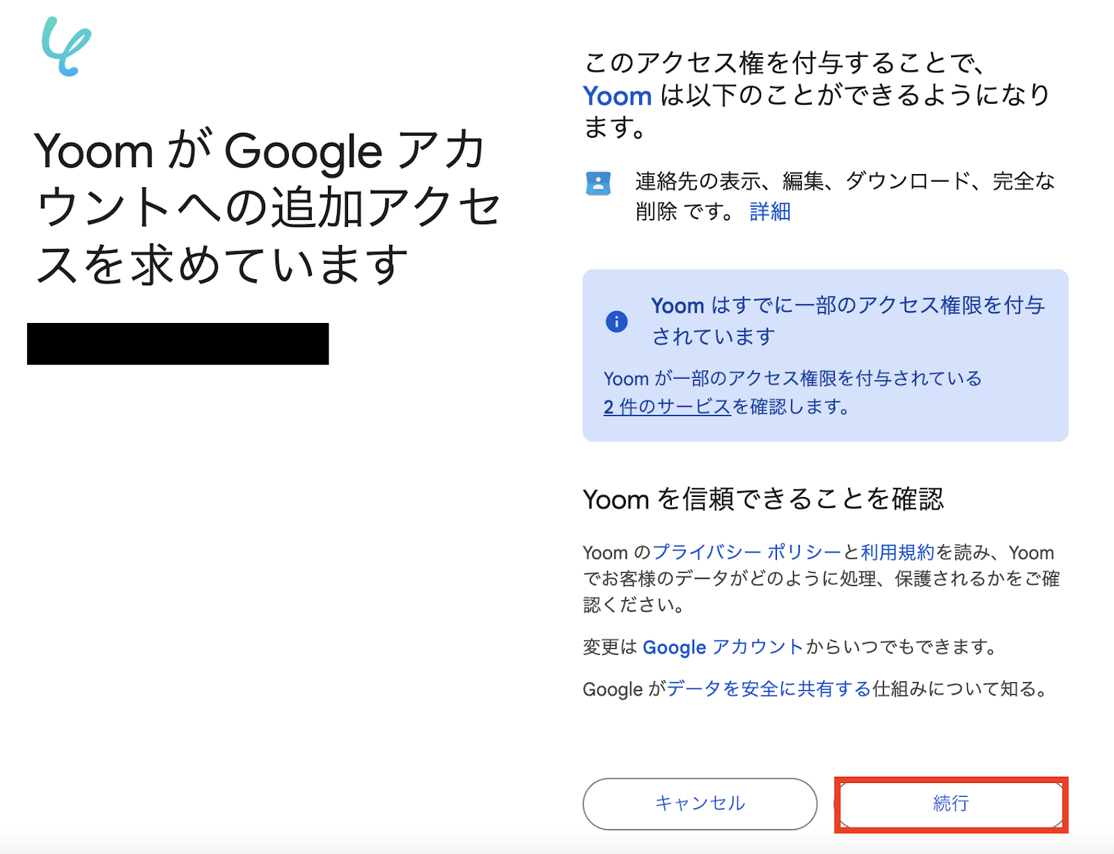 アクセス権限付与のページが表示されるので「続行」を押します。