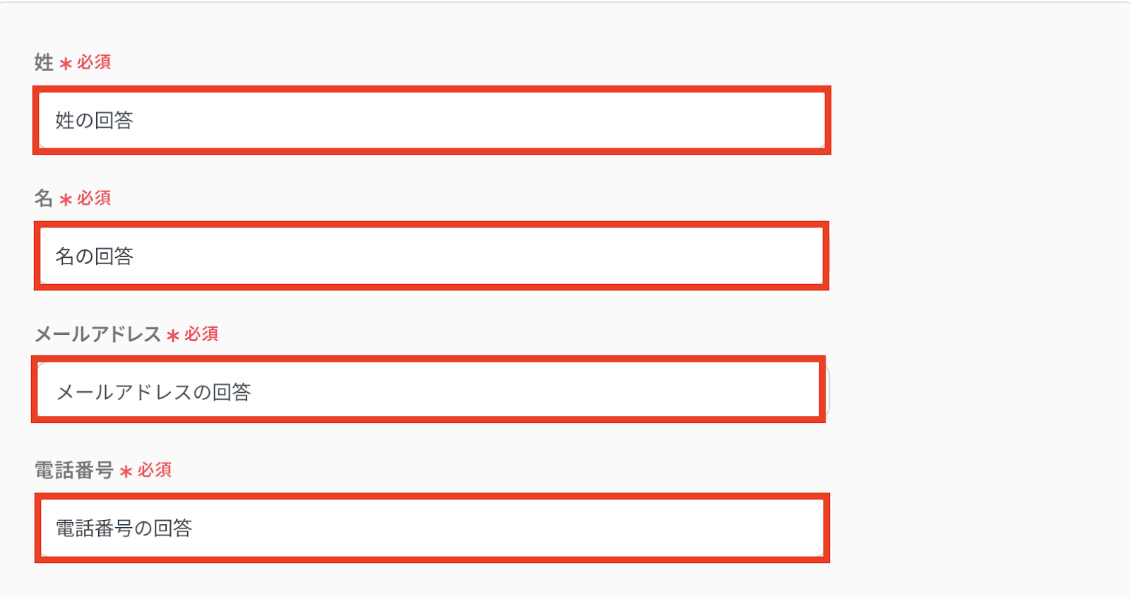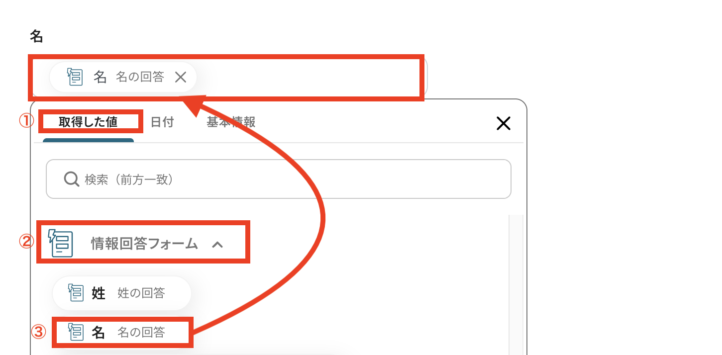 次に「取得した値」の項目がフォームの項目と一致していることを確認しましょう。
