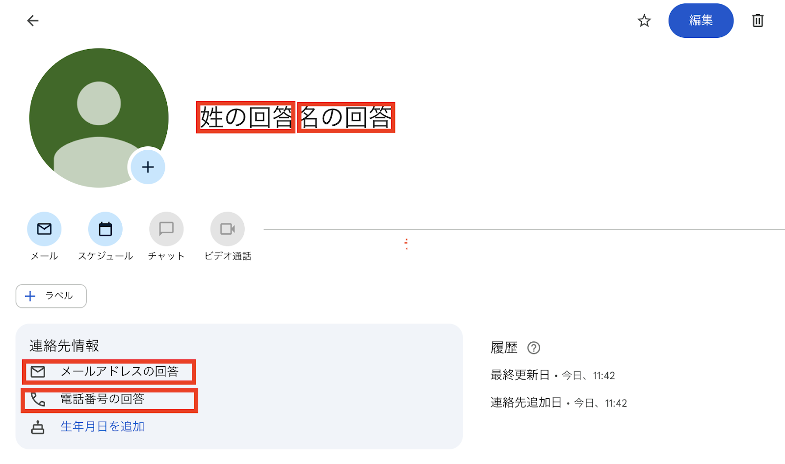 Googleコンタクトの連絡先項目に合わせて、ステップ3で作成したフォームの回答を連携していきます。