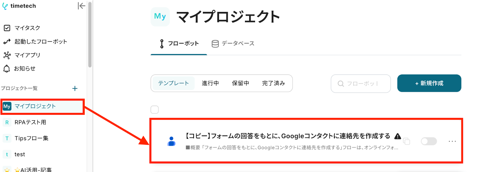 左側にあるメニューの「マイプロジェクト」から、コピーしたテンプレートを開きます。