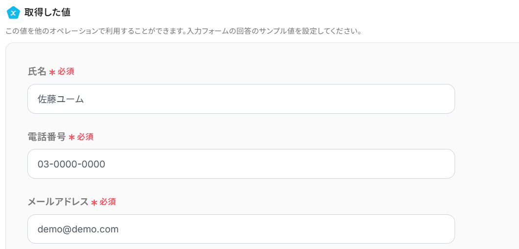 次に進み、取得した値にテストデータを入力して保存しましょう。