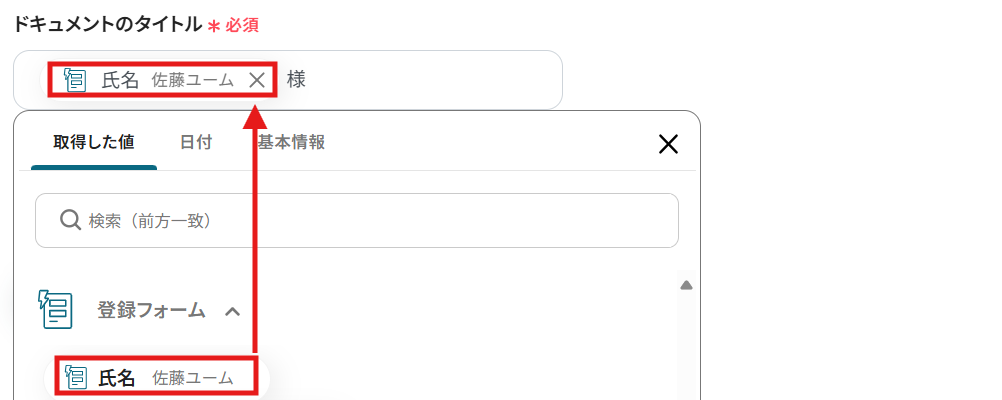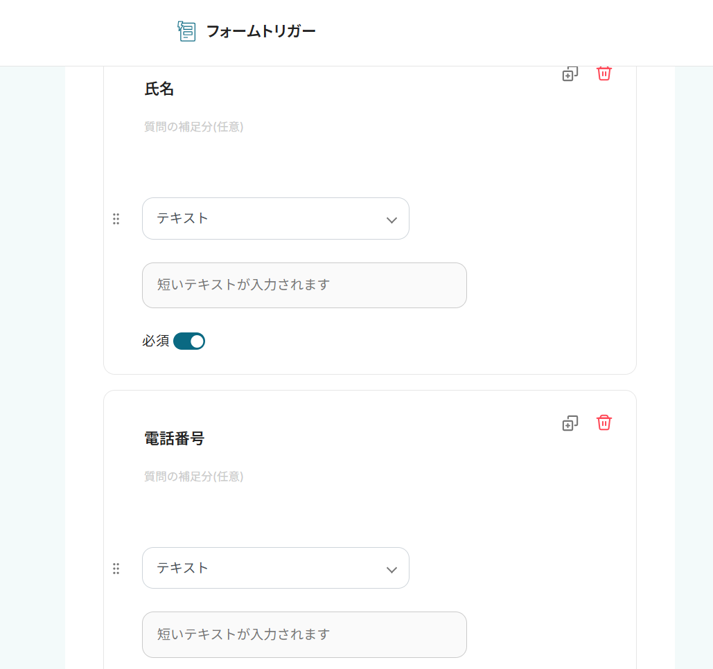 メールアドレスなどを手打ちで入力してしまうとそれが毎回転記されてしまうため、項目名以外のトリガーから取得した項目は必ずアウトプットから選択してください。