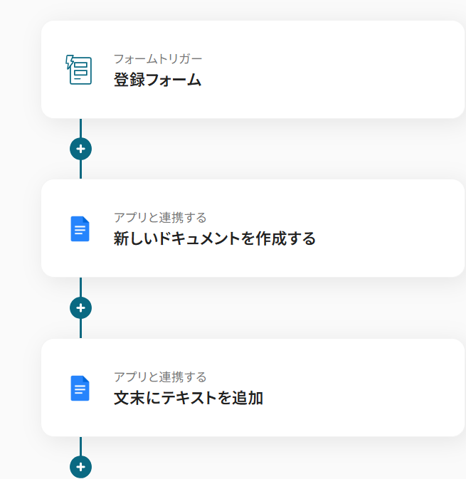 このワークフローを活用すれば、Googleフォームの送信を起点に、Googleドキュメントに自動で回答内容を保存することが可能になります。