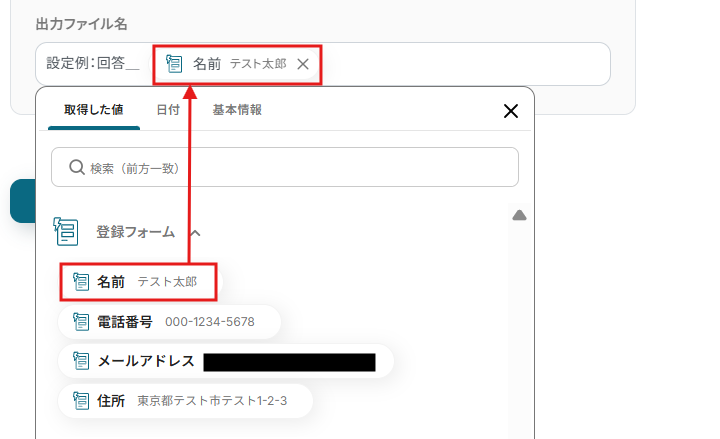 「名前」の部分は、取得した値から選択しましょう。