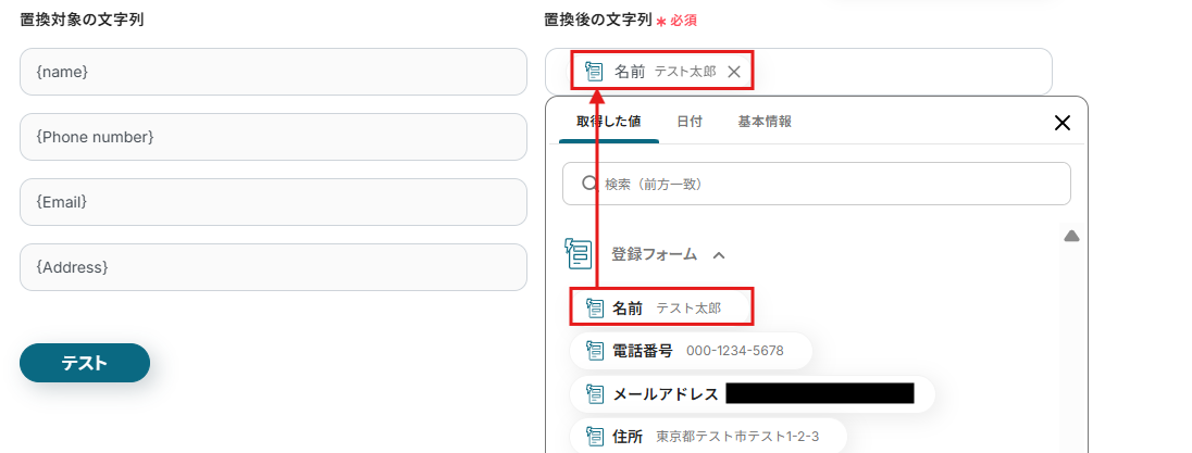 置換対象の文字列(右)に合う項目を、置換後の文字列(左)に取得した値から入力していきます。