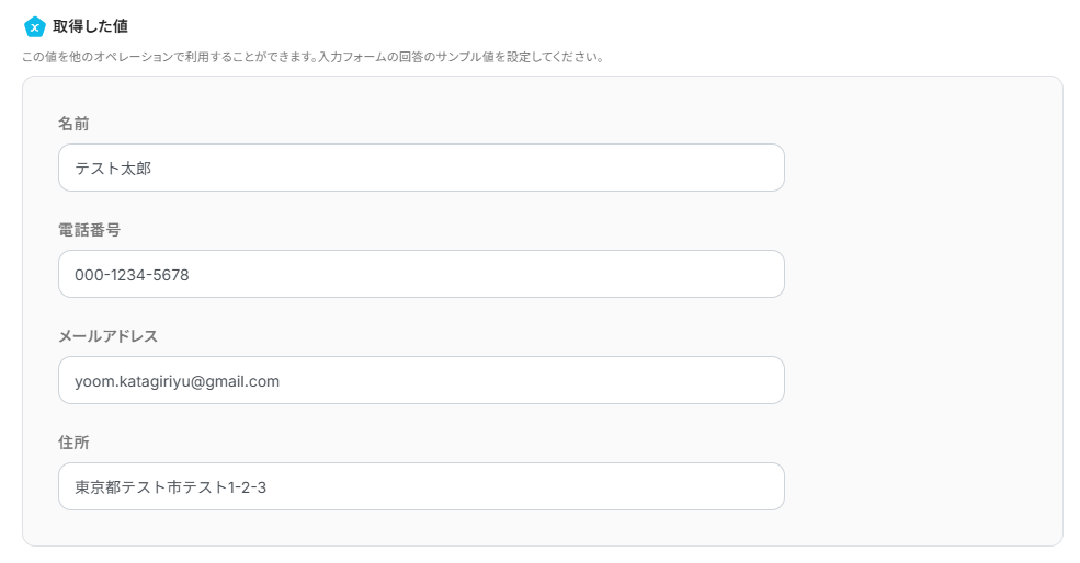 今回は、テスト用に回答用のサンプル値を入力してください。