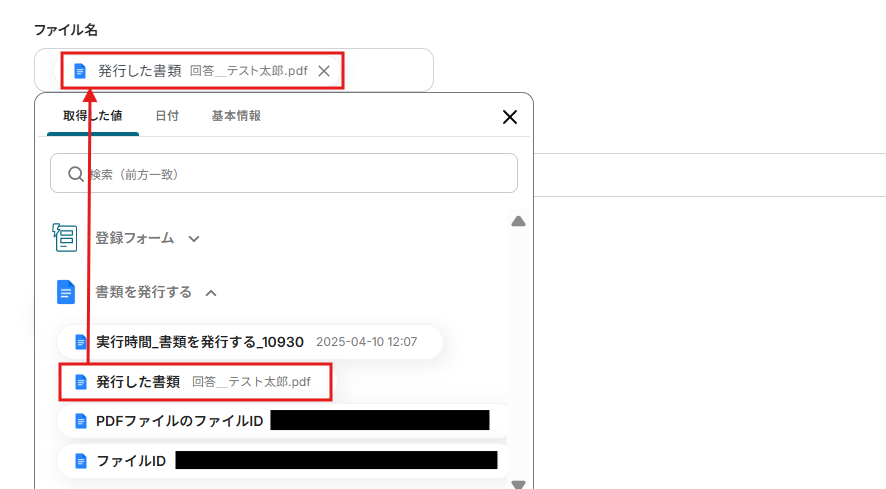 取得した値から、発行した書類を選択します。