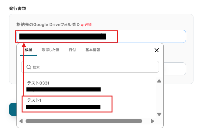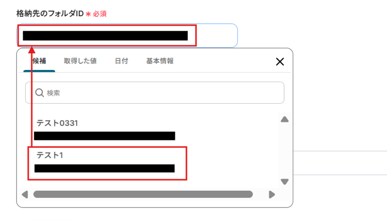 格納先フォルダIDは候補から選択してください。