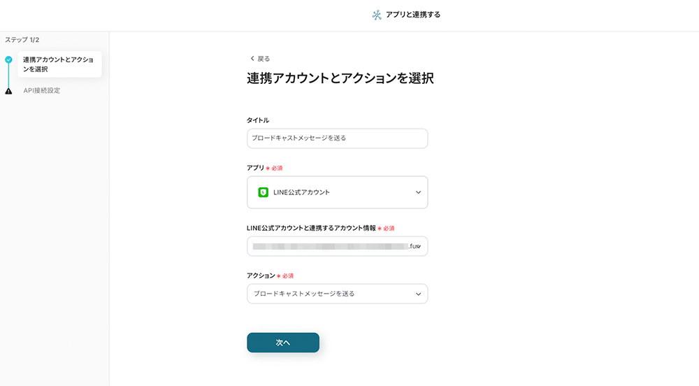 タイトルと連携するアカウント情報を任意で設定し、アクションはテンプレート通りのまま「次へ」をクリックして進んでください。