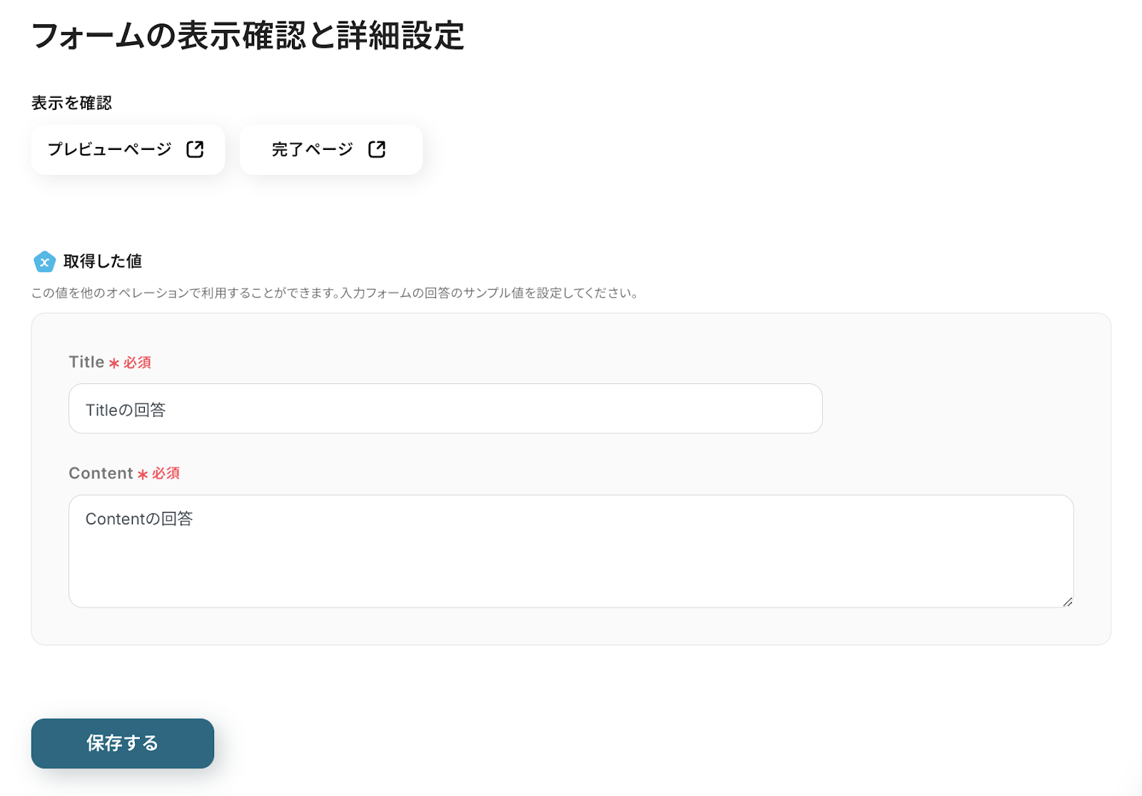 入力が完了したら次に進むと、以下の画面に移ります。 フォームの回答項目を編集・追加した場合は、以下と同様「〇〇の回答」のように設定しておくと、次のステップで設定を進める際にわかりやすくなります。