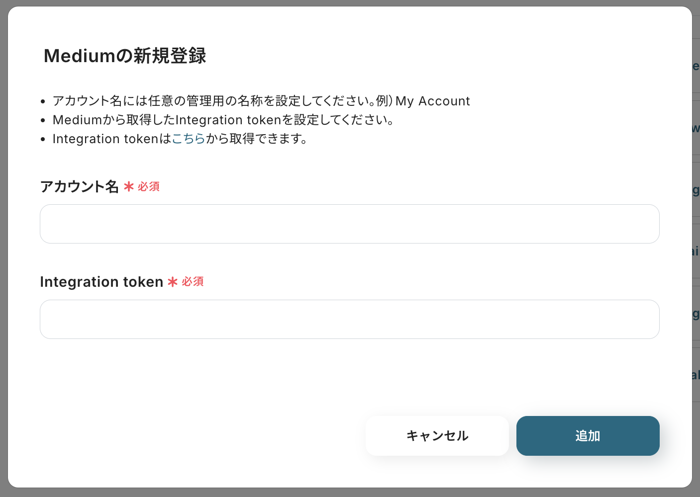 以下の画面が表示されるので、案内に従って入力を行いましょう。 Integration tokenは、Mediumの管理画面から取得できます。
