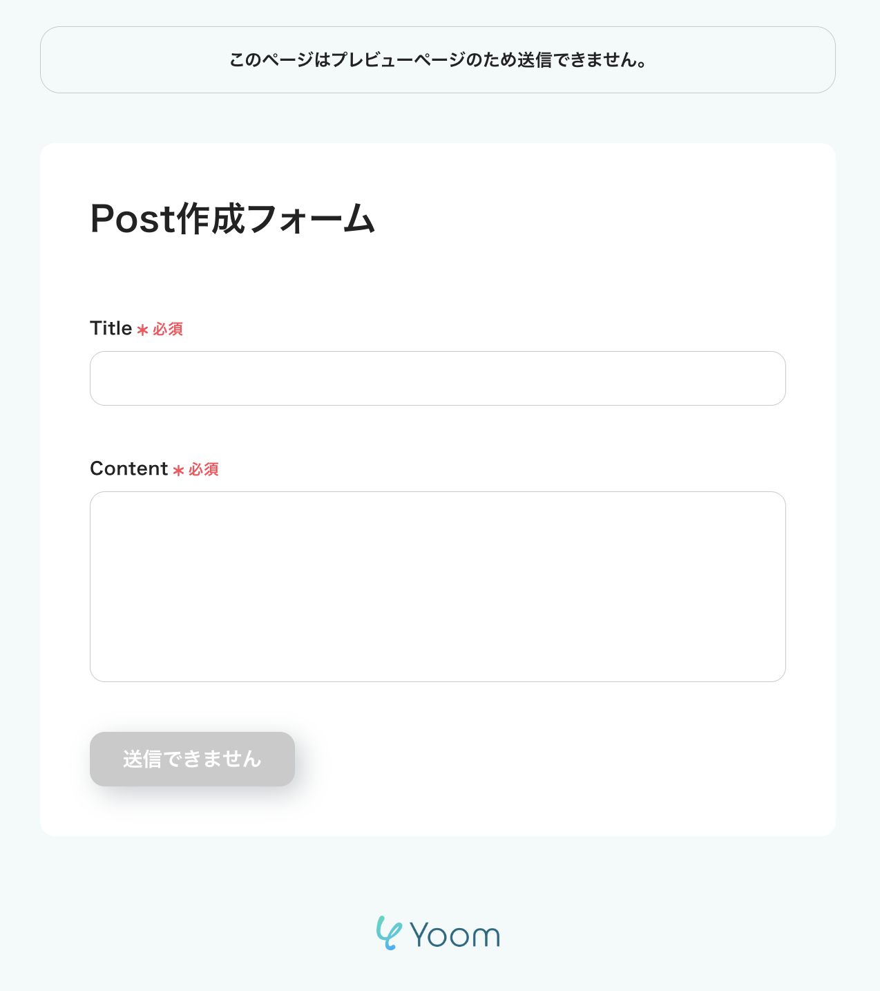 右上の「プレビューページ」をクリックすると、フォームの完成形を確認することができます。 以下は、デフォルトで設定されているフォーム内容のプレビュー画面です。