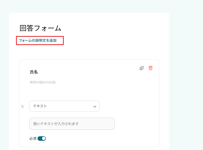 回答フォームの説明文は、下図の赤枠部分をクリックすると入力できます。