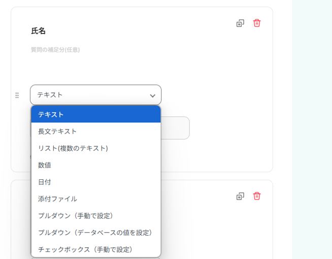 基本は「テキスト」で良いと思いますが、長文になりそうなものは「長文テキスト」、日付で答えて欲しい場合は「日付」など、適切なものを選択しましょう。