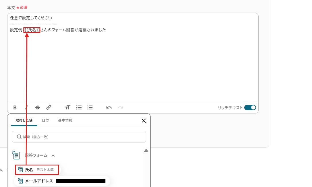 たとえば、「フォームが回答されました。」など定型的な文章は直接入力し、「氏名」などフォームの回答データを引用したい部分は、「取得した値」からアウトプットを用いて入力してください。