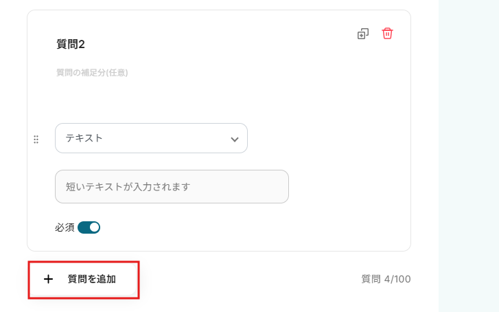 質問項目を追加したい場合は、「+質問を追加」をクリックすると追加できます。