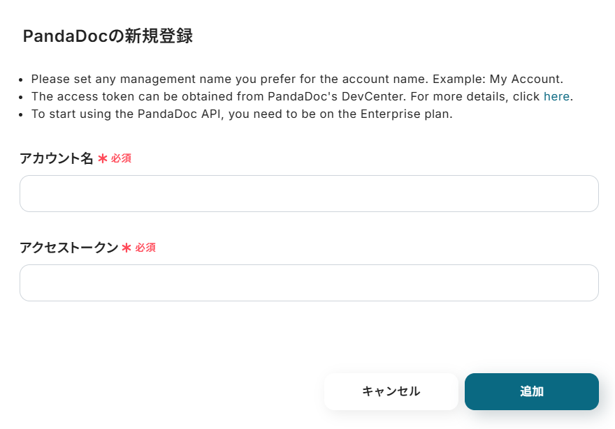 PandaDocと連携するアカウント情報を設定します。